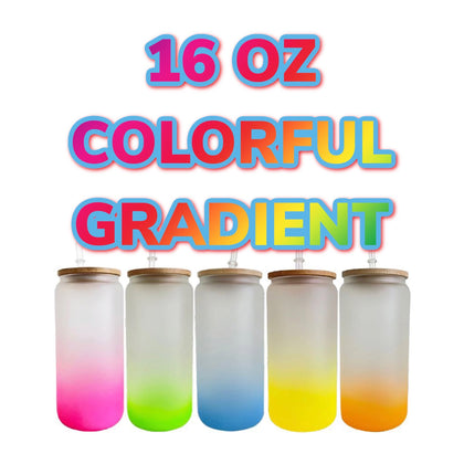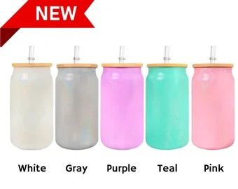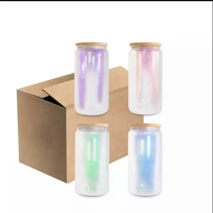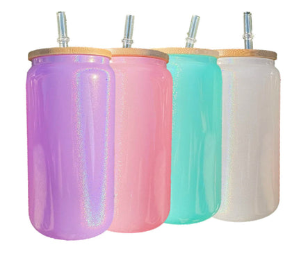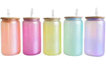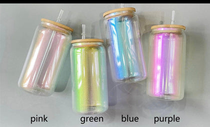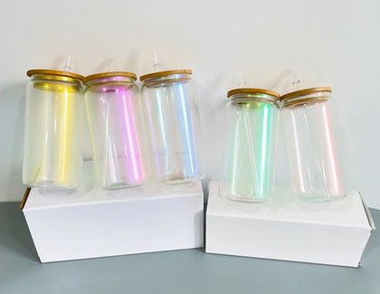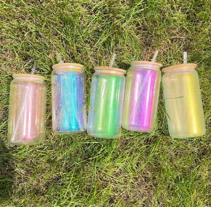 Uv + glow 16 oz Sublimation iridescent soda glass jar w/ bamboo lid