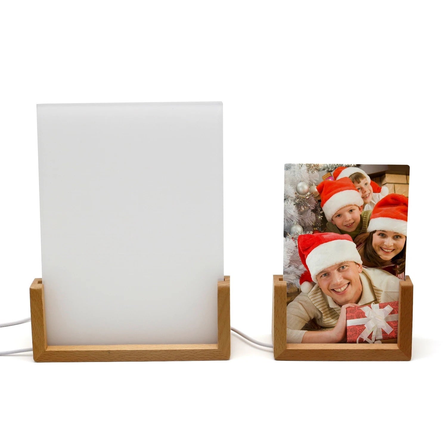 An important feature that sets these acrylic custom picture frames apart is the wood base with a warm colored LED light. This light adds a cozy touch to your photos, making viewing a pleasurable experience. Its glow is soothing to the eyes and creates a comfortable atmosphere in your space.