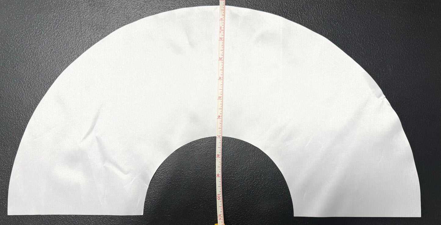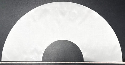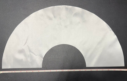 The images depict a pre-cut satin polyester fabric piece designed for crafting clack fans. The material is shaped as a wide semi-circle with a smaller semi-circular cutout at the bottom center, giving it a crescent or arc-like profile.